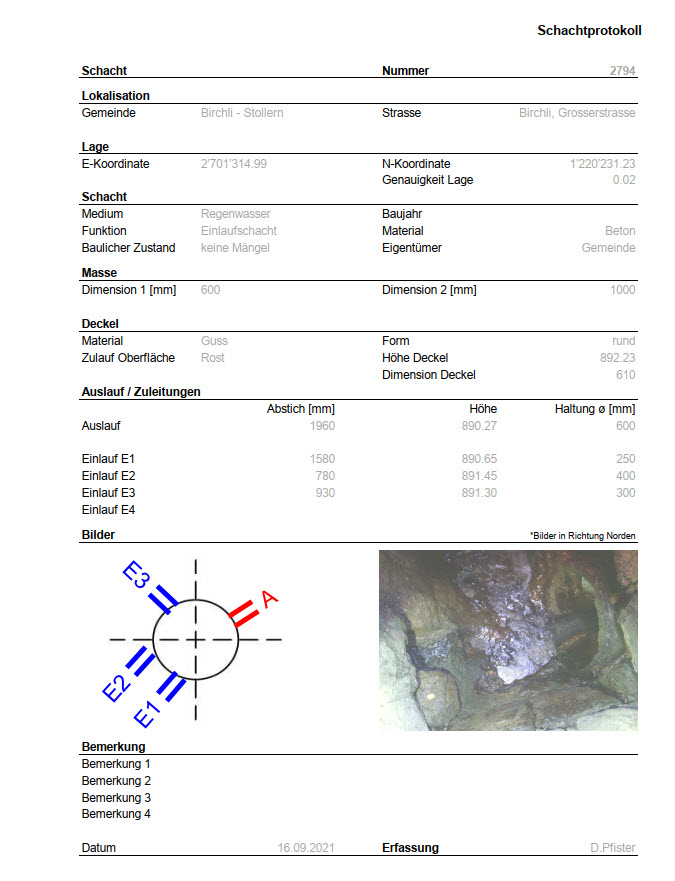 Schächte verbinden die sichtbare «Oberwelt» mit der unterirdischen Infrastruktur. Informationen über diese Zugänge zu den Werkleitungen und zur Kanalisation sind wichtig für die Unterhalts- und Projektplanung. Mittels Schachtprotokollen werden die Ein- und Ausläufe von Kontrollschächten sowie deren Zustand und Höhe dokumentiert.